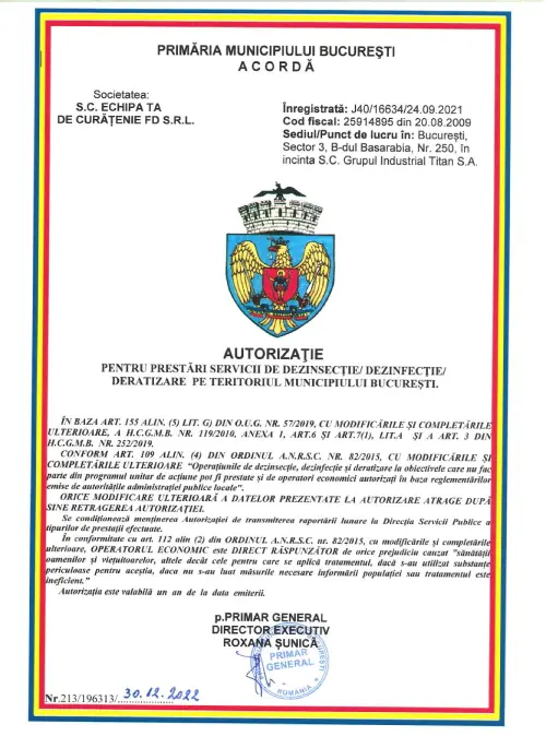 Atunci când vine vorba de serviciile noastre, ne luăm angajamentul de a respecta cele mai înalte standarde de calitate și de protecție a mediului. Deținem autorizație de funcționare eliberată de Primăria locală, confirmându-ne statutul legal și conformitatea cu reglementările locale.