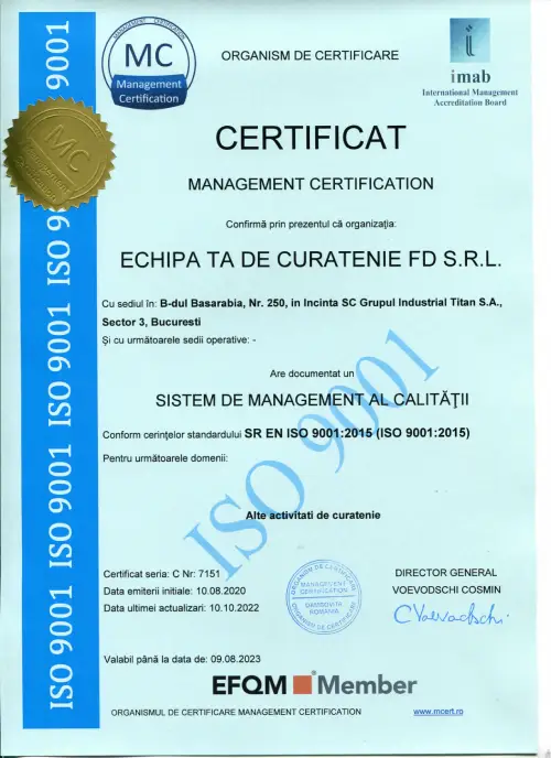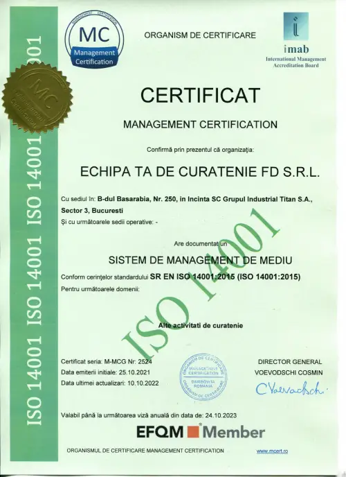 Mai mult decât atât, suntem certificați conform standardelor internaționale pentru sistemul de management al calității și sistemul de management de mediu. Acest lucru înseamnă că respectăm și implementăm cu strictețe procedurile și politicile stabilite în cadrul acestor sisteme, asigurându-ne că oferim servicii de înaltă calitate, într-un mod responsabil și sustenabil.